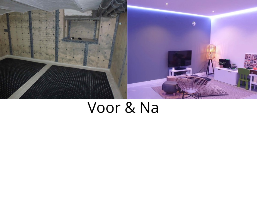TIPS: Nieuwe beton laag kan simpel op de zwarte noppen folie worden gebruikt voor een stabiele vloerplaat die dan weer getegeld kan worden of..... De muren kunnen veilig worden voorzien van een gipsplaten voorzetwand waarvan de constructie verankerd kan worden op de nieuwe betonvloer en plafond. (isolatie, stopcontacten en waterafvoervoorzieningen kunnen in deze muren weggewerkt worden).