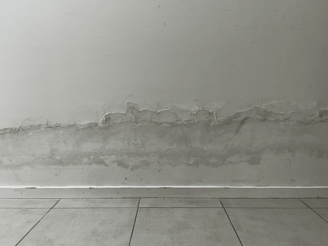 Herken natte muren op vloerniveau al dan niet met zout uitbloei op het hoogste niveau waar het vocht komt. Op deze manier is het ALTIJD opstijgend vocht, de vraag is enkel vanwaar komt het?